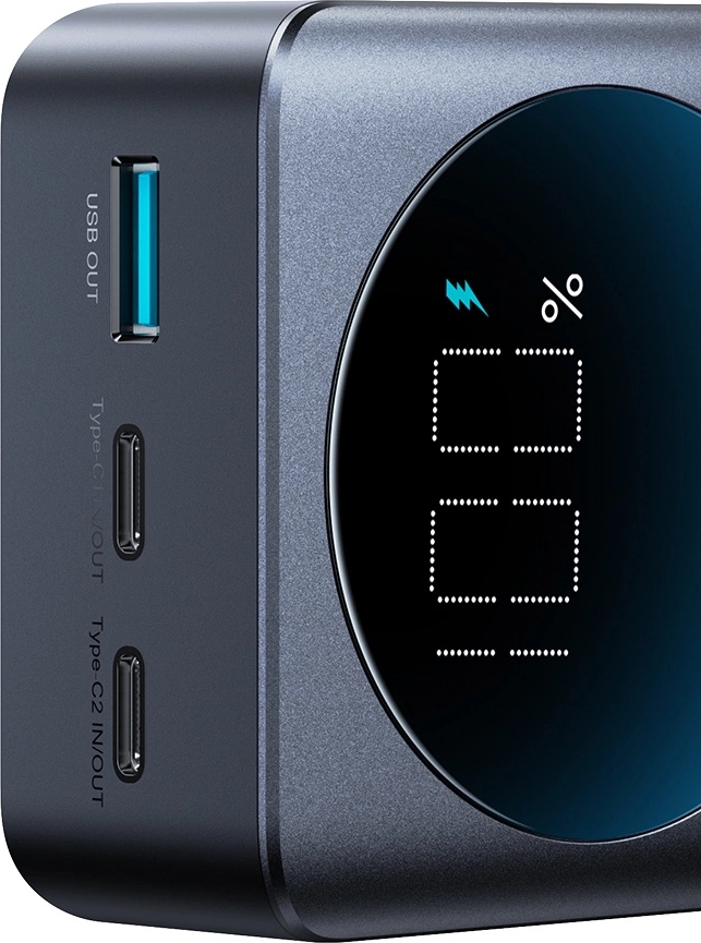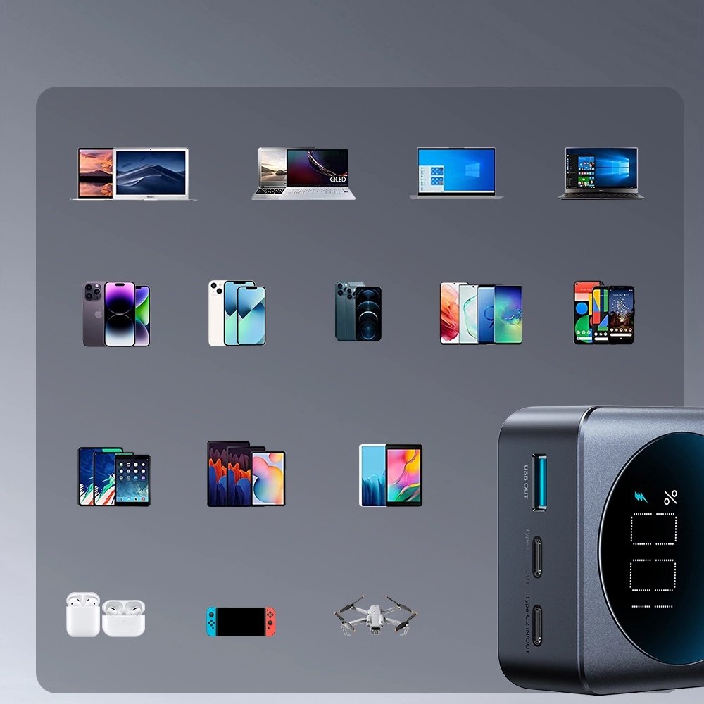Zusätzlich überzeugt die Powerbank durch ihre Vielseitigkeit: Sie verfügt über zwei Eingänge und drei Ausgänge, sodass Sie mehrere Geräte gleichzeitig aufladen können. Das intelligente digitale Display zeigt Ihnen jederzeit den aktuellen Ladezustand an und sorgt für eine einfache Handhabung. Mit intelligentem Temperaturmanagement bleibt alles sicher und kühl – selbst bei intensiver Nutzung.